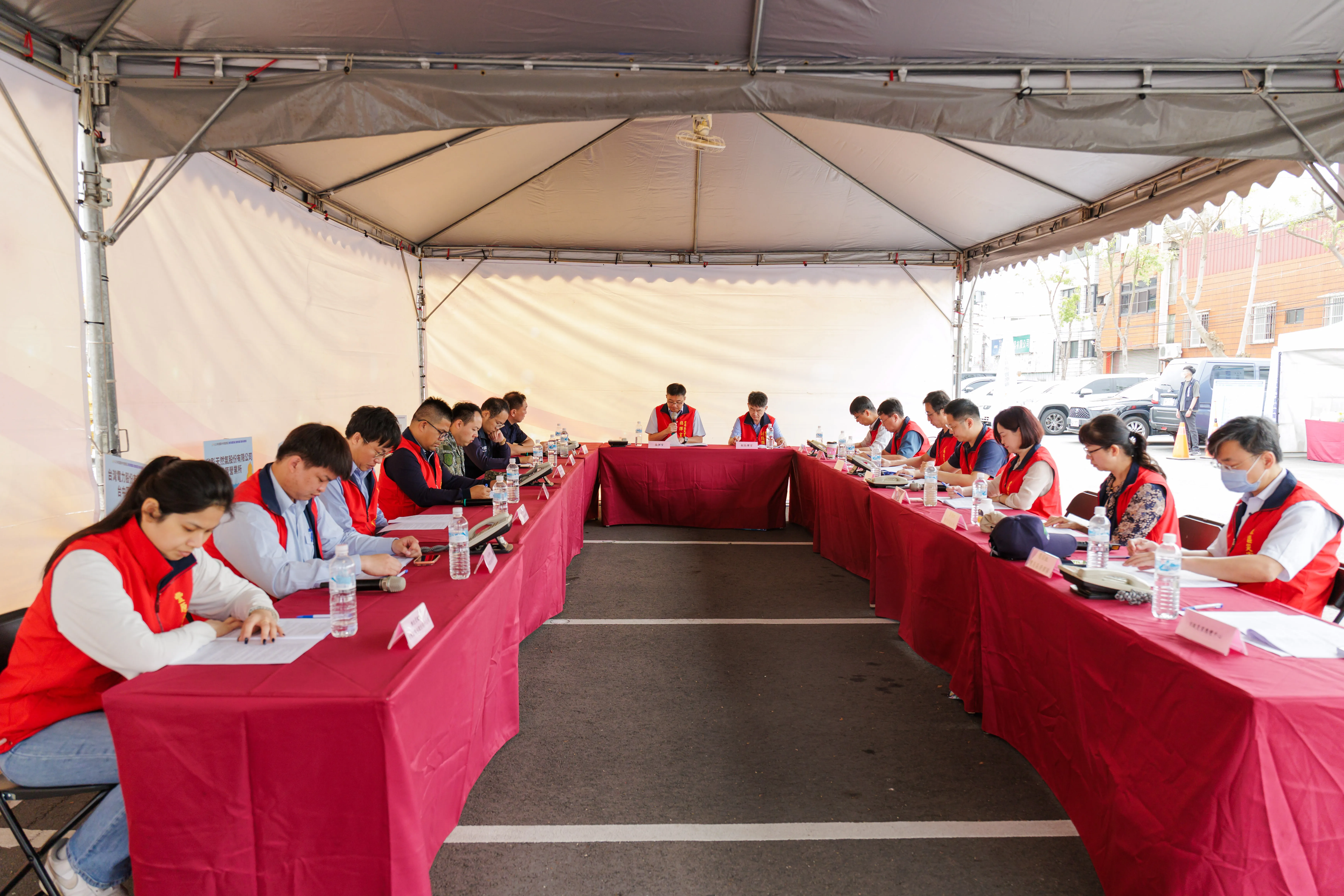 災害應變指揮中心。演習嚴格依據《災害防救法》及地區防救災計畫,規劃共計 16 項應變作業流程,預防與撤離:包含社區居民協助清淤、沙包發放、優先撤離行動不便的弱勢民眾,以及針對大面積淹水實施垂直疏散與救溺演練。緊急管制與補給:進行橋樑封閉管制、民眾強制撤離,並確保災民在收容點的食品與飲水補給無虞。設施搶修與復原:針對震後受損的天然氣、自來水、通訊設施與道路交通進行即時搶修,隨後展開路面抽水與環境清理消毒,確保災區迅速恢復正常運作。