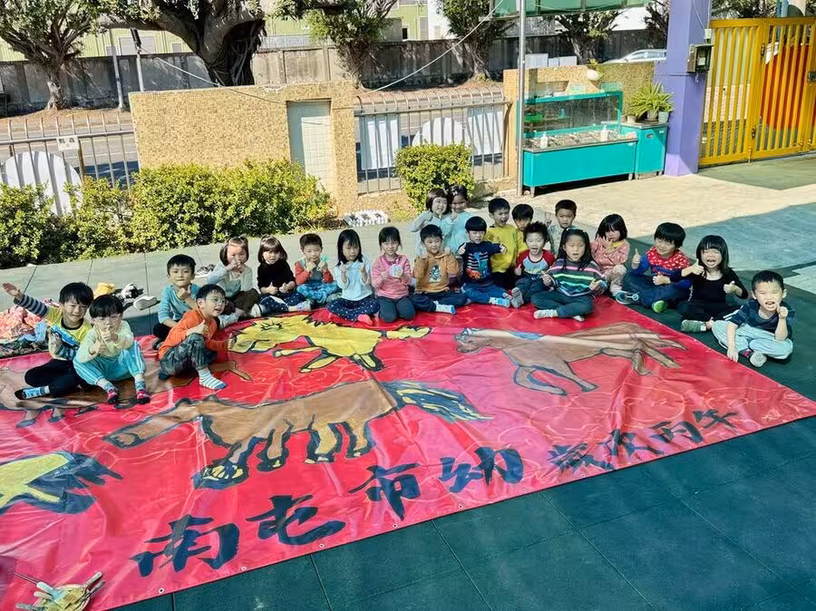 南屯幼兒園長期以食農課程作為核心本位之一,其中延續多年的年度重點活動,便是農曆新年前的圍爐慶賀。全園各班會共同採收一學期悉心照顧的作物,齊心準備年節佳餚,讓孩子在實作中感受分享與團圓的意義。除飲食活動外,園方亦同步規劃新年環境佈置,透過藝術創作迎接嶄新的一年。延續去年的十三條、長達十尺春聯所營造的視覺氣勢,今年配合即將到來的馬年,特別創作一幅長達二十尺的巨幅畫作「十四駿迎春」,近日即將懸掛於校園建築大牆,展現奔放昂揚、昂首向前的新年意象。