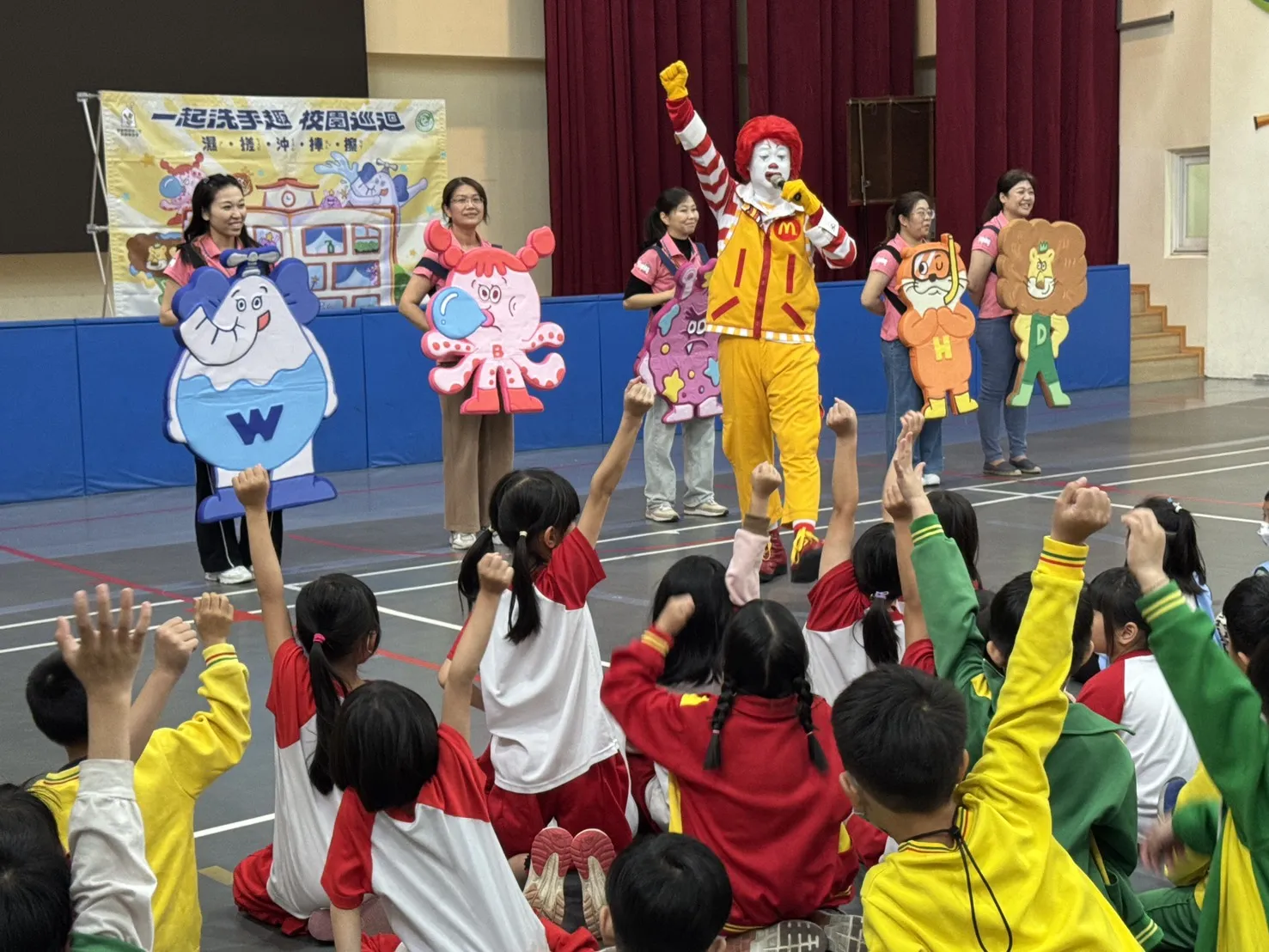 麥當勞叔叔帶領全校師生,讓宣導活動宛如一場校園嘉年華。