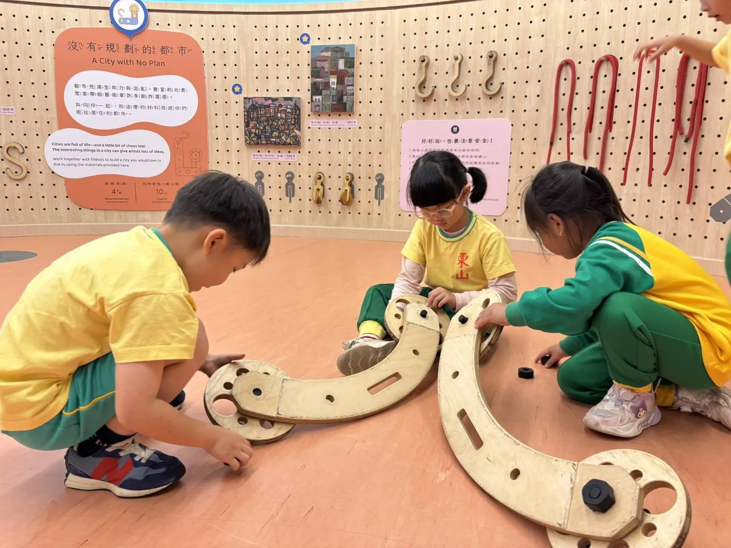 「好奇洞」與「故事洞」:透過小積木與觸覺設施提供感官刺激,並在閱讀天地中利用隔板搭建專屬的秘密基地。「創造洞」與「變形洞」:孩子們利用拼湊、堆疊、線條磁鐵與大型積木,在透明塗鴉牆上自在揮灑,享受動手組裝的成就感。「穿越洞」:宛如魔法世界,運用光影、透明片與道具,讓孩子自編角色與情境,上演專屬的光影小劇場。