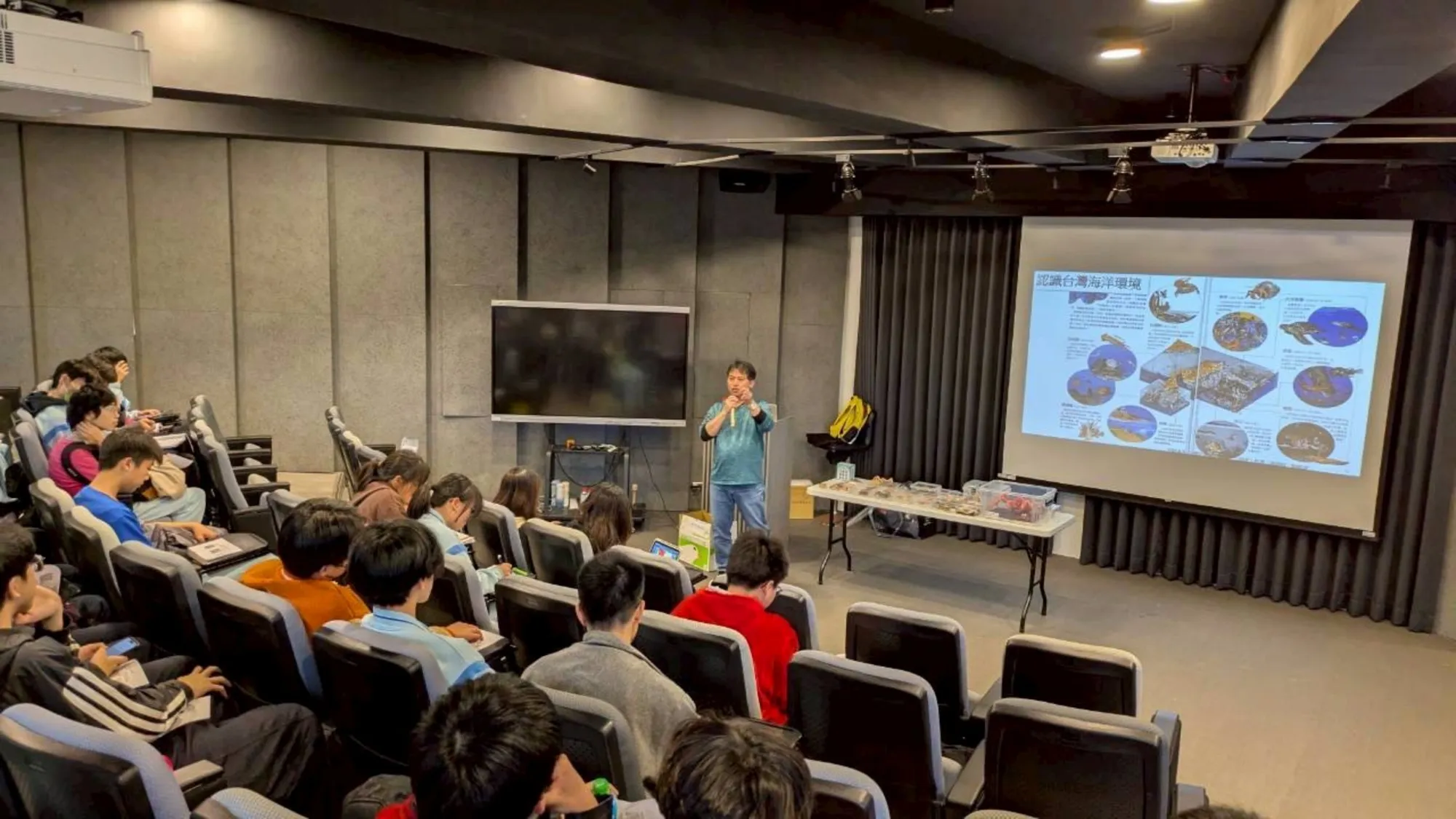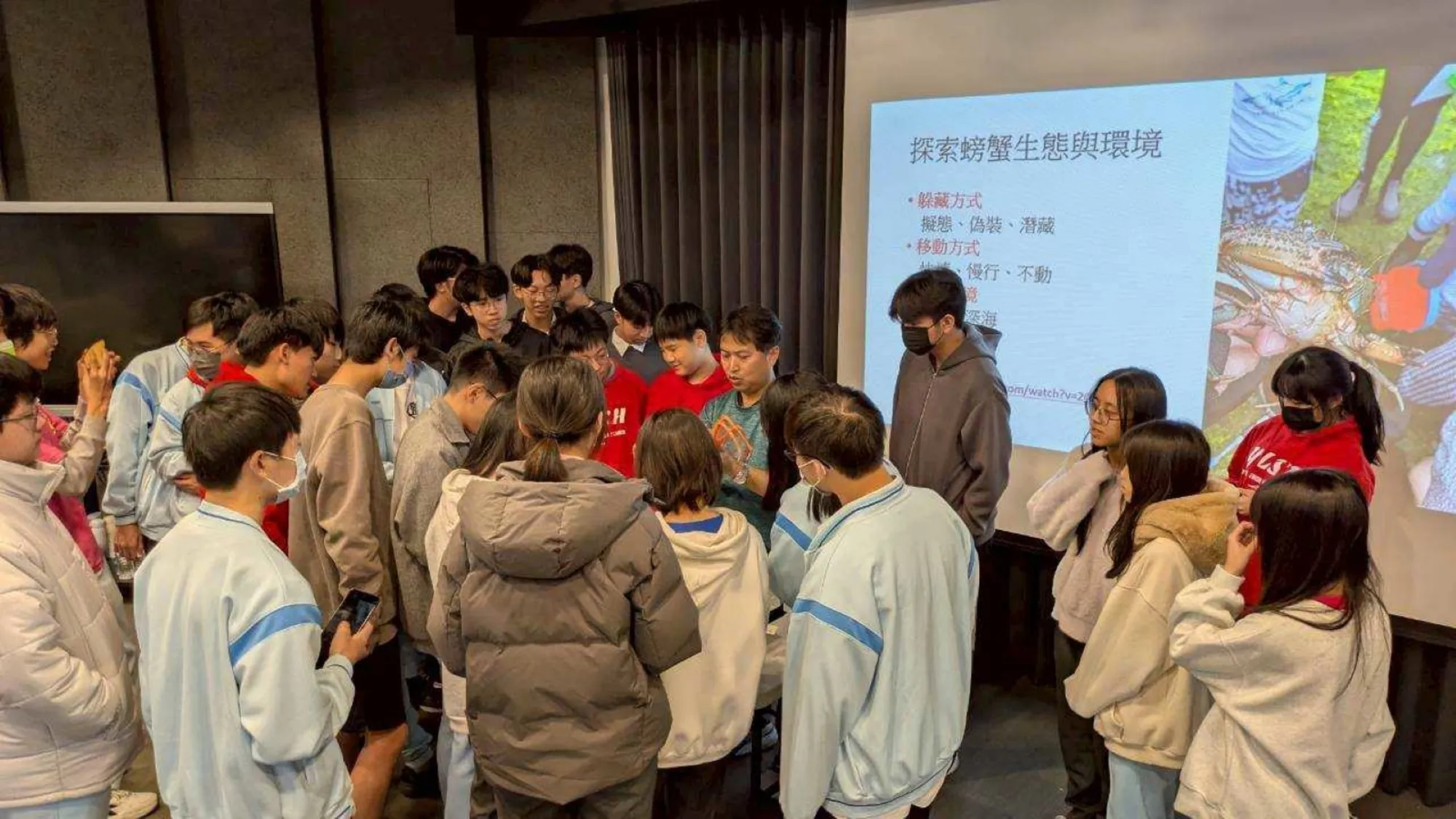 為了打破學生的刻板印象,林老師在講座中詳細介紹了螃蟹除了橫走外,還具備奔跑與爬樹的運動特性。現場亦展示多件色彩鮮豔的螃蟹標本,林老師特別說明其採用的特殊製程,如何解決標本易褪色的難題並保存自然原色。透過近距離的實物觀察與觸摸,學生們展現了高度的學習興趣,在好奇心的驅動下有效提升了科學觀察力與對海洋生物的同理心。