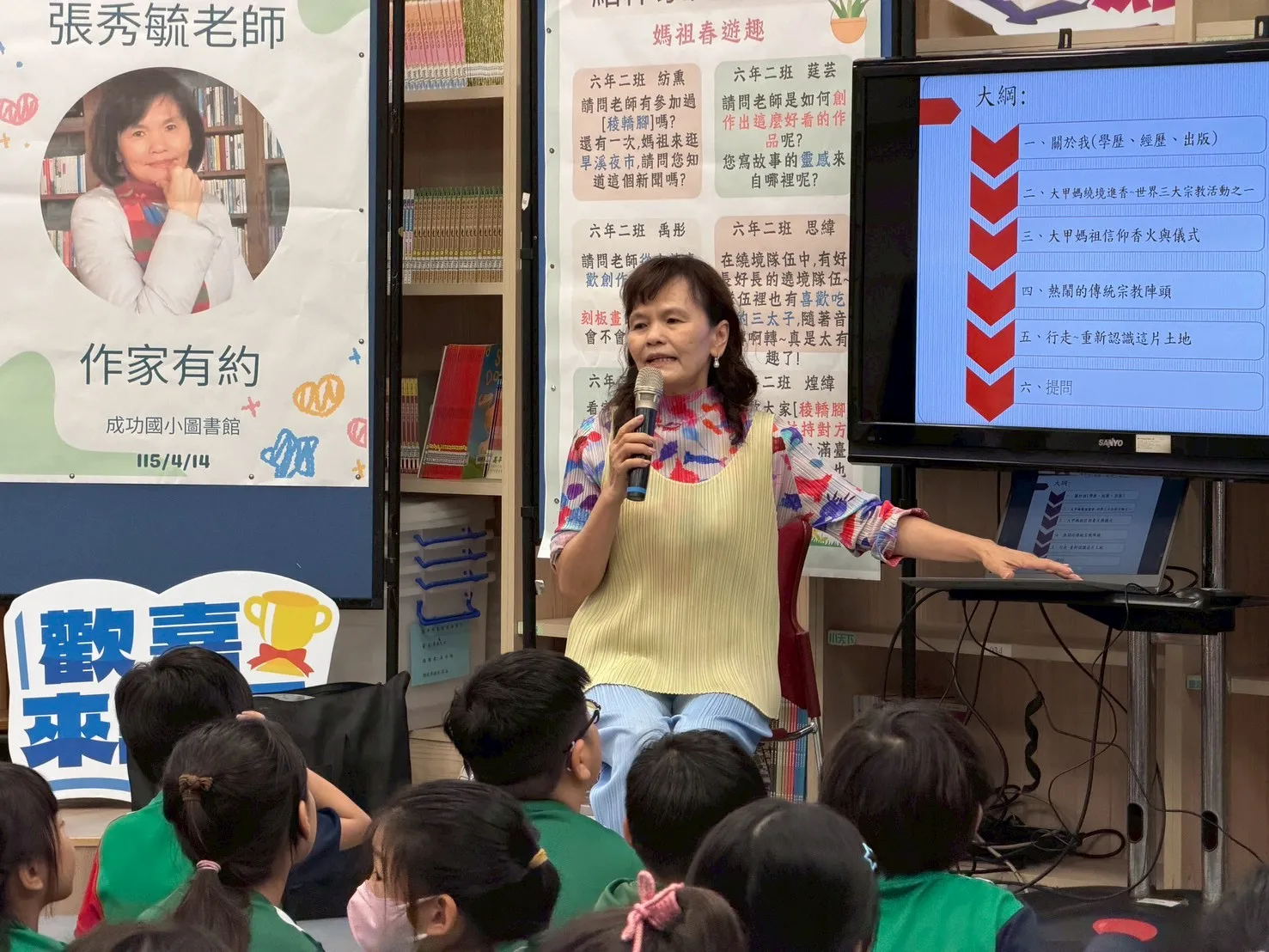 臺中市成功國小特別邀請知名作家張秀毓老師至校,分享多年的創作歷程與經驗。為響應「世界閱讀日」並深化學子對家鄉文化的認同,臺中市成功國小舉辦「與作家有約」閱讀饗宴。本次活動特別邀請知名作家張秀毓老師蒞校,與學童面對面分享創作歷程,並透過繪本《媽祖春遊趣》引領孩子們在文字與色彩中探索台灣特有的宗教盛事,將閱讀素養與在地生活經驗完美連結。
