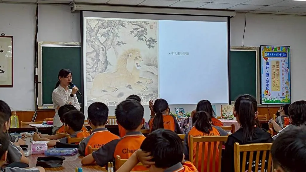 在作品分享環節,陳老師特別介紹了其作品《皇帝有座動物園》。這部作品巧妙地將古代宮廷畫作與現代創意結合,透過「古今結合」的手法,將原本生硬的歷史轉化為生動的視覺饗宴。孩子們在驚嘆「原來古代動物長這樣」的同時,也體認到創意並非憑空而來,而是必須從觀察與歷史中汲取養分,再注入個人的色彩與詮釋。
