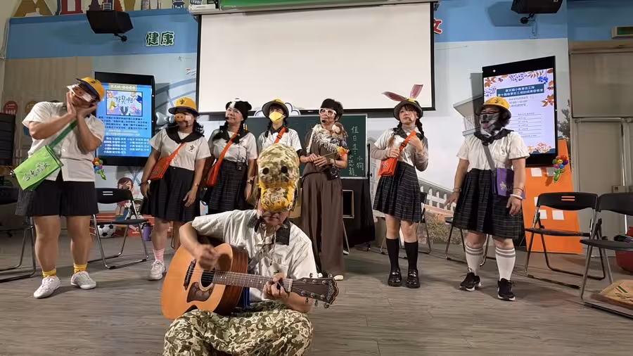 今年新學員分為三組進行故事表演,其中一組家長特地穿上孩子的制服,以學生身份登場,演繹繪本《好臭啊》、《什麼都要管的鴨霸王》、《卡諾小鎮的新朋友》。表演中,臭鼬因緊張散發氣味、小鴨因口氣強硬失去朋友、小妖怪則在關鍵時刻伸出援手,透過生動肢體語言與角色詮釋,完整呈現繪本精神。