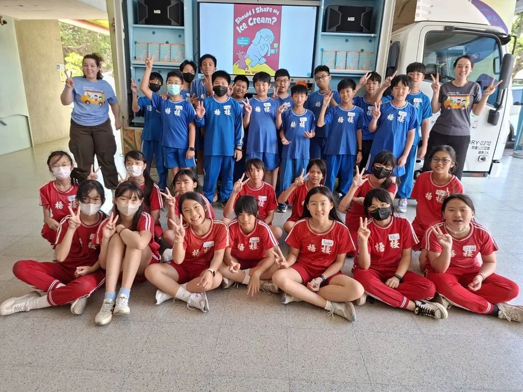 活動由外籍老師 Sophie 與 Miranda 領銜,為學子們導讀經典繪本《Should I Share My Ice Cream?》。兩位老師運用豐富的肢體語言與抑揚頓挫的生動語調,將學生帶入充滿想像力的故事情境中。在互動問答的過程中,學生受氛圍感染,自然而然地複誦並運用如 Cheer up(振作起來)、Yummy(美味的)、Tasty(可口的)及 Flavor(口味)等核心詞彙,展現了極高的學習動機與參與度。