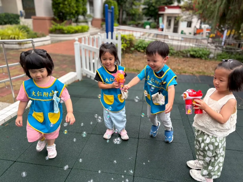 隨著雨勢暫歇,校園隨即展開熱鬧非凡的泡泡派對。不論是在遊戲場還是走廊,孩子們手持泡晶瑩剔透的泡泡棒與泡泡槍,吹出一顆顆繽紛的泡泡。看著泡泡輕盈飄向天空或在追逐中破裂,校園內充斥著「泡泡飛好高!」的興奮吶喊聲,孩子們燦爛的笑容成為雨後最美的風景。