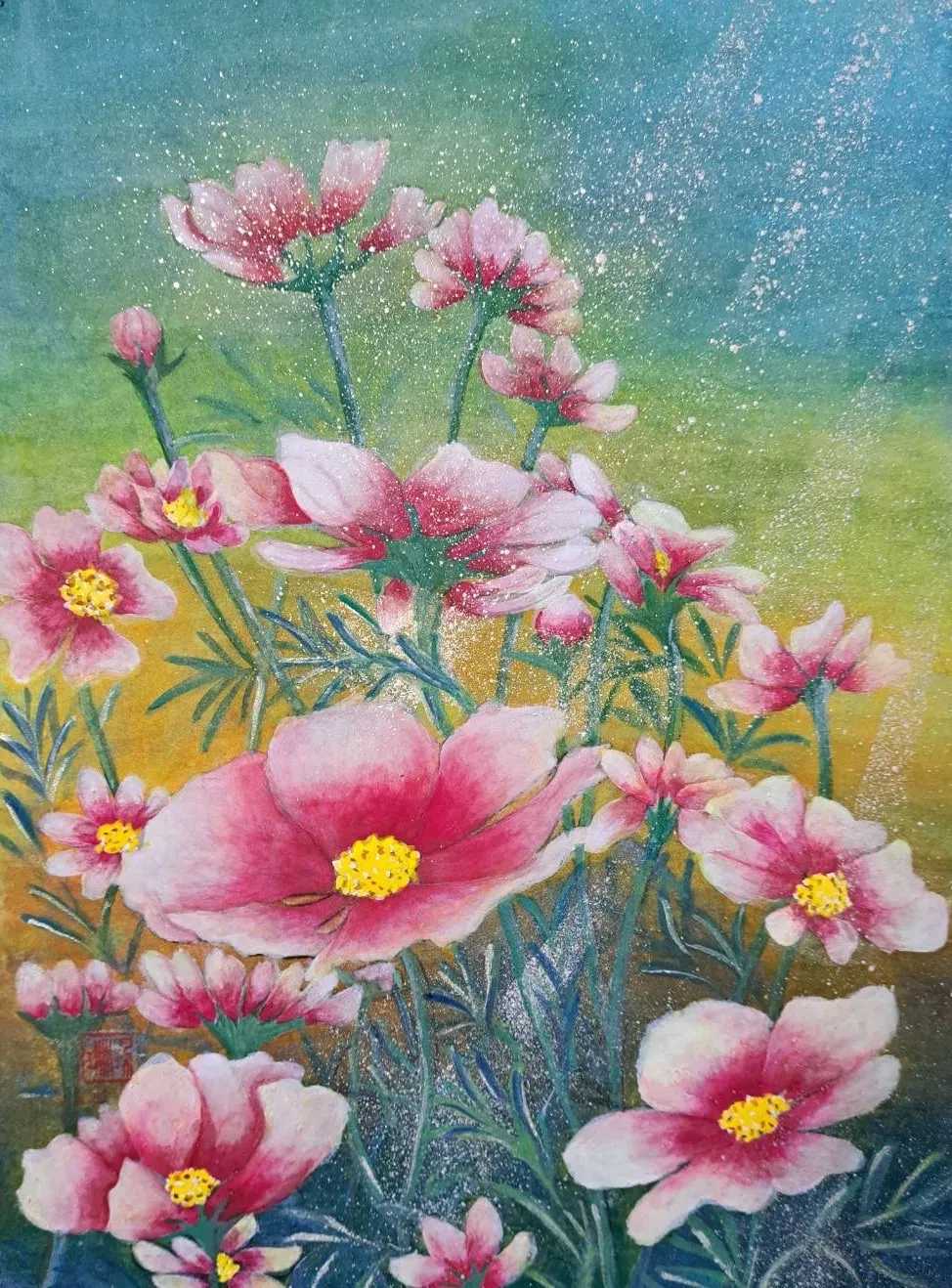 竟心藝苑苑長王佳以分享,藝術創作不僅是形式的呈現,更是回歸內在、安定心靈的動態過程。她的膠彩作品獨特地融合了書法的線條節奏與膠彩的色彩層次,並靈活運用霧吹、滴流與拍打等專業技法,捕捉自然生命的律動,賦予畫面典雅且具質感的細膩風貌。此次聯展亦由羅珈瑩、詹彩鳳、許倩怡、黃曼凝、詹珮珊及李鳳珠等多位創作者共同參與,期盼透過不同視角的藝術語彙,匯聚豐富的正向力量並傳遞給社會大眾。