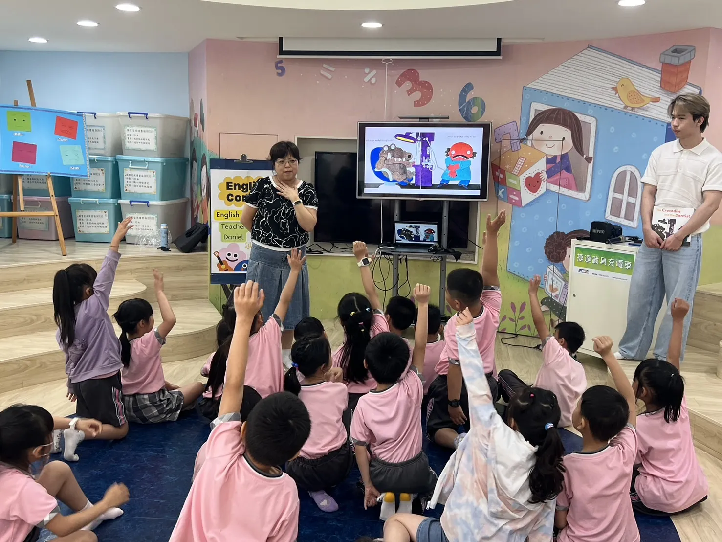 活動核心圍繞著知名英語繪本《Crocodile and the Dentist》展開。Teacher Daniel 巧妙運用有趣的動畫帶動讀,引導學生細膩觀察故事中鱷魚與牙醫在面對診視時,那種既緊張不安卻又必須展現勇氣的情緒起伏。透過繪本角色的表情變化,孩子們在潛移默化中學會辨識複雜的情緒,並建立起深刻的心理共鳴。