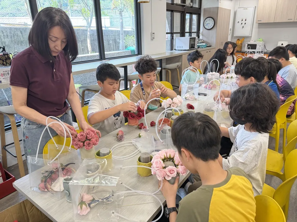 這項活動能圓滿進行,背後的重要支柱是桐林國小志工隊的無私奉獻。志工夥伴們承擔了巨大的行政與指導工作,從前期的花材挑選、繁瑣的採購與備料,到活動現場耐心指導孩子完成每一道工序,皆投入了大量的時間與心力。她們以默默耕耘的職人精神,陪伴每位孩子完成獨一無二的心意,成為校園中最溫柔的支持力量。
