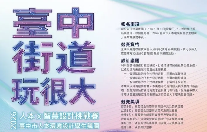 為落實「以人為本」的城市願景,台中市政府建設局今年擴大舉辦第二屆「全國大專院校人本環境設計學生競圖」。本次競賽以台中街道玩很大-人本智慧設計挑戰賽」為主題,不僅延續對人行空間的關注,更進一步結合 5G、物聯網與 AI 等智慧科技,即日起至5月6日開放投稿,設置20個獎項、總獎金高達 10.5 萬元,邀請全國大專院校青年學子投入城市規劃。