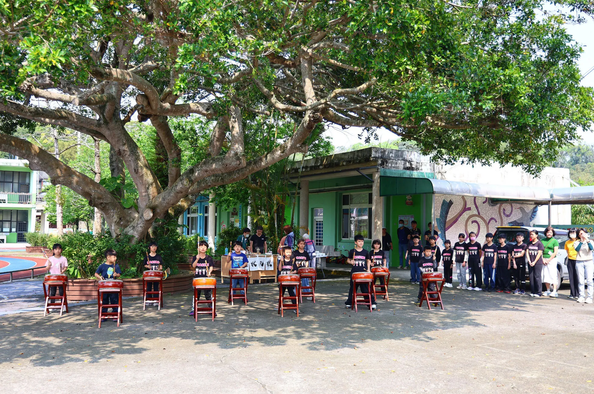 沙坑國小全校師生熱情迎接,並以鼓樂表演揭開序幕。