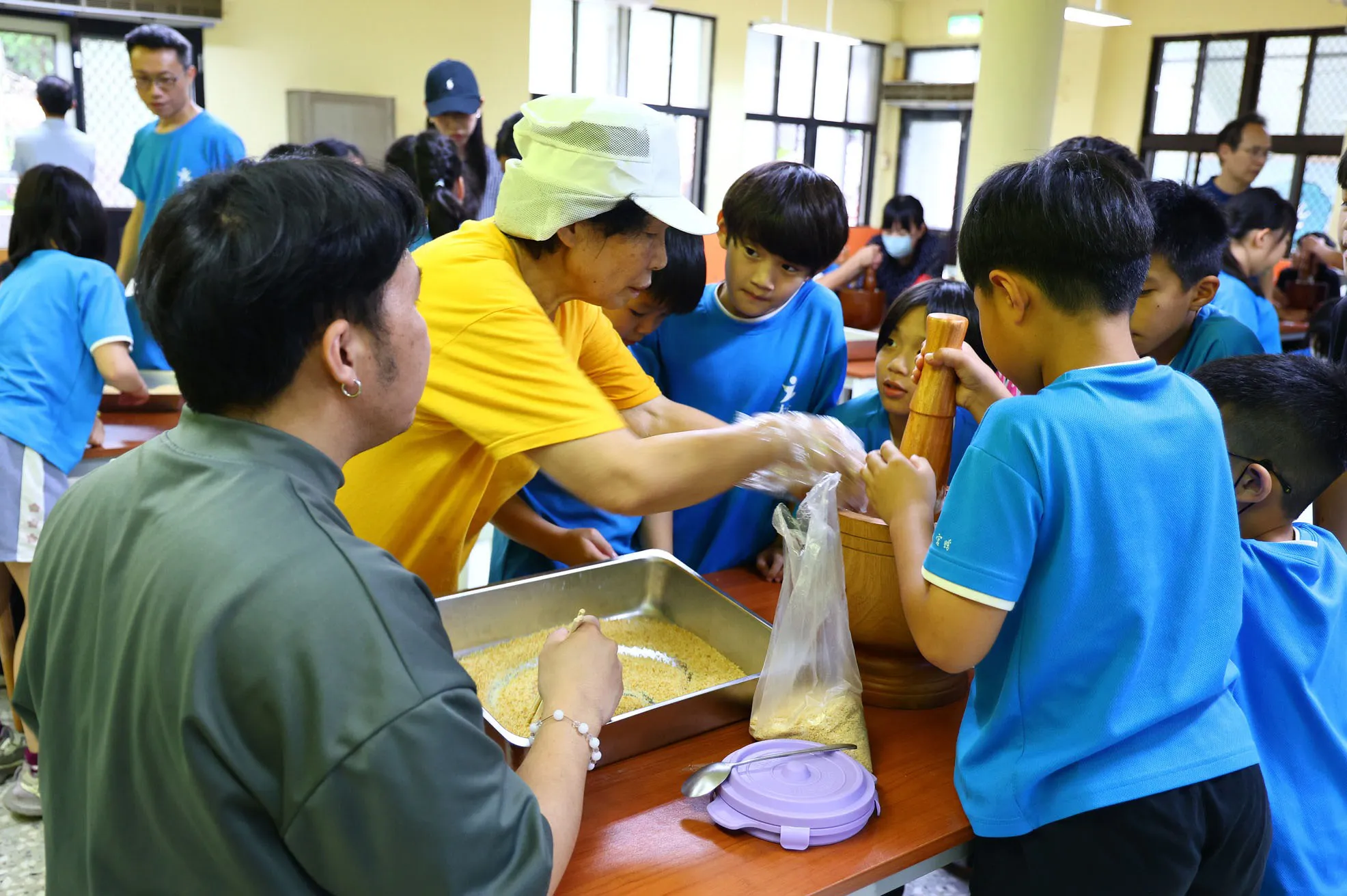 飯後沙坑國小廚媽帶大家進行客家麻糬製作體驗。義煮活動的重頭戲是由「魚丸伯」領軍的虱目魚丸粥製作,部分學生更親自進入廚房協助備料,體驗勞動的價值。午餐時分,除了熱騰騰的魚丸粥,沙坑國小亦貼心準備了烤鴨夾餅、炒米粉及狀元糕等豐盛佳餚。餐後,學生們在沙坑國小廚媽的指導下,親手搗製傳統客家麻糬,從揉捏到品嚐的過程充滿歡笑與成就感。