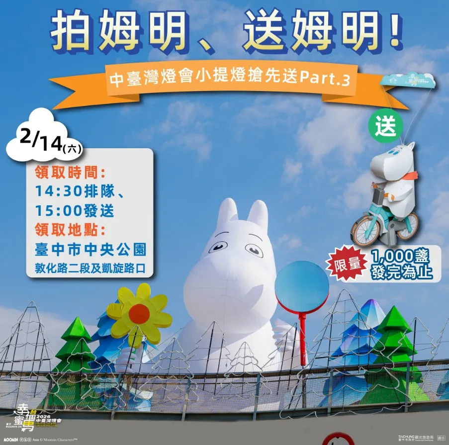 姆明一族的療癒魅力不僅帶動社群討論,更實質轉化為觀光產值。根據觀光署統計,受惠於燈會熱潮,台中旅宿業春節連假前 8 天的平均訂房率約達 5 成 8,高居「六都第一」。觀旅局長陳美秀指出,姆明系列花燈與分布在台中各地的城市打卡點,已成為全台最熱門的燈會 IP。這項成功的跨界合作不僅提升了台中觀光的國際能見度,也展現了智慧城市與經典 IP 結合的強大吸粉力。 為了讓民眾提前感受佳節氛圍,市府將於 2 月 14 日情人節當天舉辦「拍姆明、送姆明」活動,在中央公園限量發送 1,000 盞姆明小提燈與 300 份主題拍貼體驗券。燈會展期自 2 月 15 日起至 3 月 3 日(元宵節)止,為期 16 天的展出(除夕休展)將陪伴市民度過最浪漫的新年。觀旅局誠摯邀請全台民眾把握假期來到台中,與姆明一族共同走入北歐神話般的極光之夜。